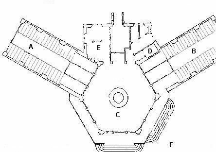 Original plan of the station. A: The pier of funicular Campo dei Fiori B: The pier of funicular Sacro Monte C: Transfer hall D: Toilet E: Office F: Train Varese-Vellone |