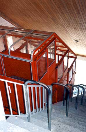 The cabin 1 at the top station. The cabins are composed of three compartments. La cabine 1 à la gare supérieure. Les cabines sont composées de trois compartiments. |