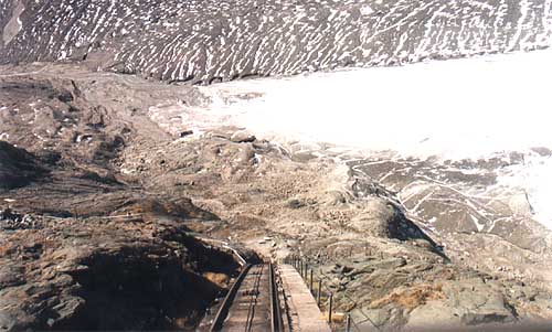 From the funicular, an interesting vue of the two parts, black and white, of the glacier of Pasterze. Note that it is the end of the white part. Depuis le funiculaire, une vue intéressante sur les deux parties, noire et blanche, du glacier du Pasterze. Notez la fin de la partie blanche. |