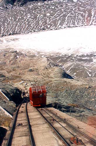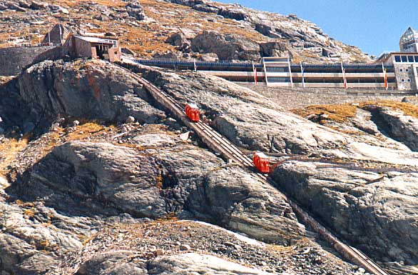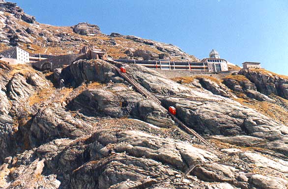 d'atteindre le pied du plus haut sommet d'Autriche. Aujourd'hui la glacier du Pasterze ne fait plus que 9 kilomètres de long. Il a perdu environ un kilomètre de longueur depuis 125 ans! En 1963 un funiculaire fut construit pour faciliter l'accès du glacier aux nombreux touristes. Quand le funiculaire fut construit, le niveau de la glace du glacier arrivait jusqu'à la gare inférieure du funiculaire. Aujourd'hui le funiculaire n'est plus assez long pour atteindre le glacier! |