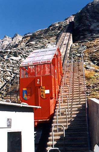 On this view we can appreciate the very steep gradient of this funicular. On the cabin, the blazons of Helligenblut (left) and Carinthia. La gare inférieure. Sur cette vue on peut apprécier la très forte pente de ce funiculaire. Sur la cabine, les blasons d'Helligenblut (à gauche) et de Carinthie. |