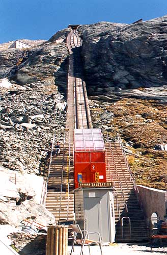 Vue générale du funiculaire depuis la surface du glacier. Notez qu'en 1856 la surface du glacier était au niveau de l'évitement actuel du funiculaire, c'est à dire à mi-chemin entre les deux cabines rouges! |