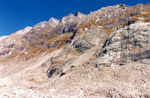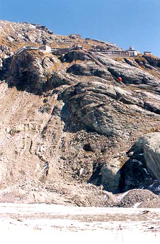 In 1963 the surface of the glacier was reaching the level of the bottom station where is the red cabin on the photo (yes, find it!). Franz-Josefs-Höhe sous le Freiwandspitz (3035 m). En 1963, la surface du glacier atteignait le niveau de la gare inférieure, là où se trouve la cabine rouge sur la photo (oui, vous pouvez la chercher!). |