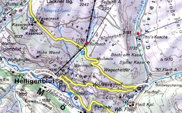 ![]() The map of the area around Heiligenblut. The yellow road is the famous road, built in 1935, Großglockner-Hochalpen-straße which goes to the Franz Josefs Höhe and to Zell am See. But if I publish this map it is to show another curiosity of the area which is unique in Europe, the Stollenbahn Roßbach-Fleißalm bahn (Tunnelbahn on the map between the two red points). It is a 1,6 kilometers tunnel which is used, in summer, as a pipeline for the water and, in winter, as gondolas for the skiers to go from Roßbach to the Fleißalm ski area. The difference of level is 63 meters. La carte de la région autour d'Heiligenblut. La route jaune n'est autre que la célèbre route, construite en 1935, Großglockner-Hochalpen-straße qui conduit au Franz Josefs Höhe et à Zell am See. Mais si je vous montre cette carte c'est pour montrer une autre curiosité, qui est unique en Europe, le Stollenbahn Roßbach-Fleißalm Bahn (indiqué Tunnelbahn sur la carte entre les deux points rouges). C'est un tunnel long de 1,6 kilomètres qui est utilisé en été comme conduite d'eau et en hiver comme télécabine pour les skieurs pour aller de Roßbach à la zone de ski de Fleißalm. Le dénivellé est de 63 mètres. |
